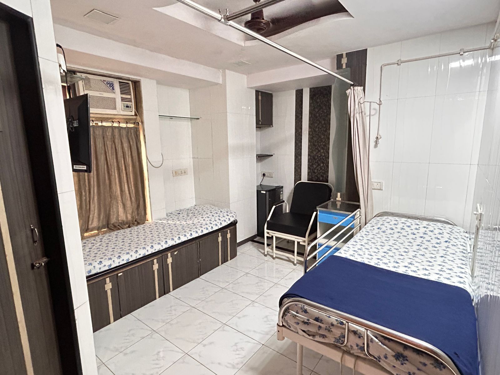 Separate Male and female general wards with toilets, TV, food tables and attendant mattress. Facility for both Indian and Western toilets.